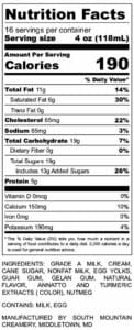 Ingredients: Grade A milk, cream, cane sugar, dry egg yolk, dry whole egg, whey, vanilla with natural flavors, natural caramel flavor, locust bean gum, nonfat dry milk, sea salt, molasses, cinnamon, carrageenan, guar gum
